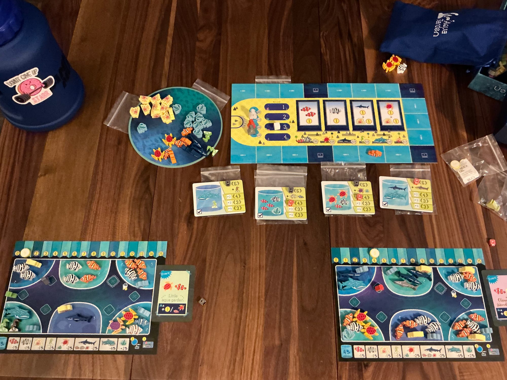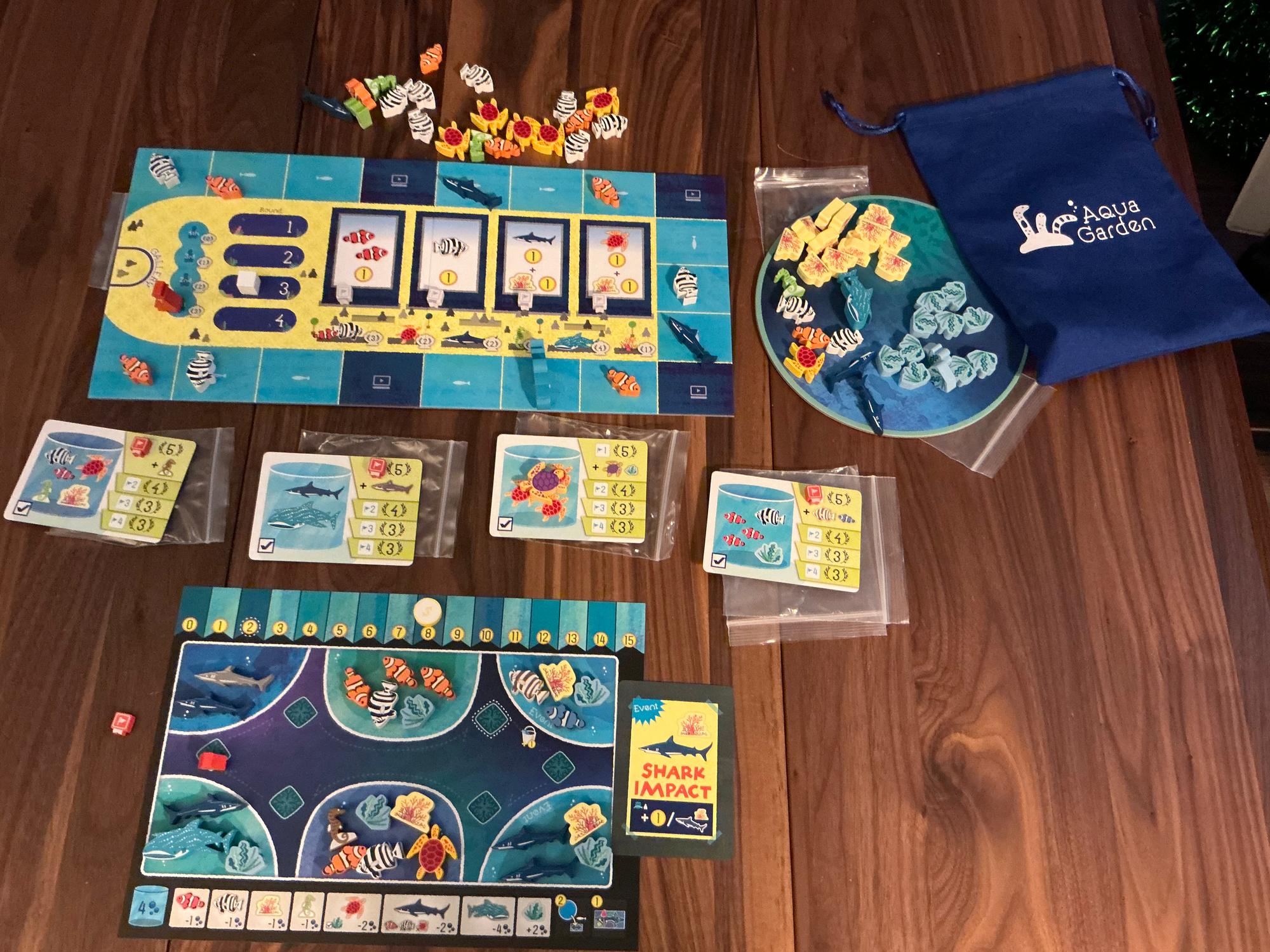 Aqua Garden is a really small game where you go around a turn track, collecting either fish to add to your aquarium or adveterisement income based on the fish you've collected. There are placement and capacity rules for fish with the goal of racing for common goals for points and bonus fish. You're also managing a little rondel which dictates what aquariums you can modify as well as bonus income when you make a full rotation. After a certain number of rounds, the game will end and you'll score based on your aquariums and if you met any public goals.