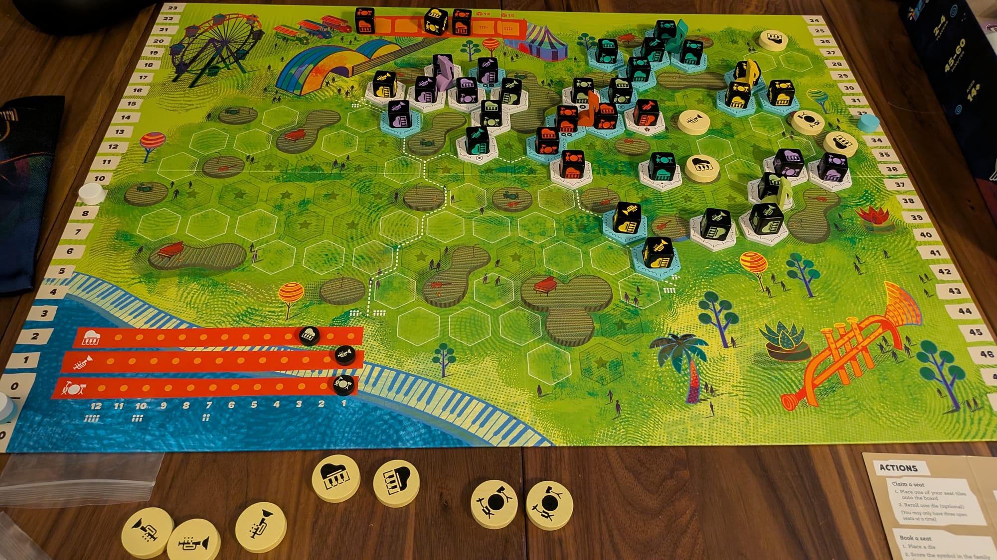 Probably the hardest thing to wrap your head around is the fact that family groups are shared between player seats, though majority will matter for scoring purposes. The game also pushes a race to have performances happen early as they score more for being the early performance versus later. At the end, the largest grouping of each of the 5 family scores and that will go to whoever has majority of each instrument with the points based on how many performances you claimed for that instrument.