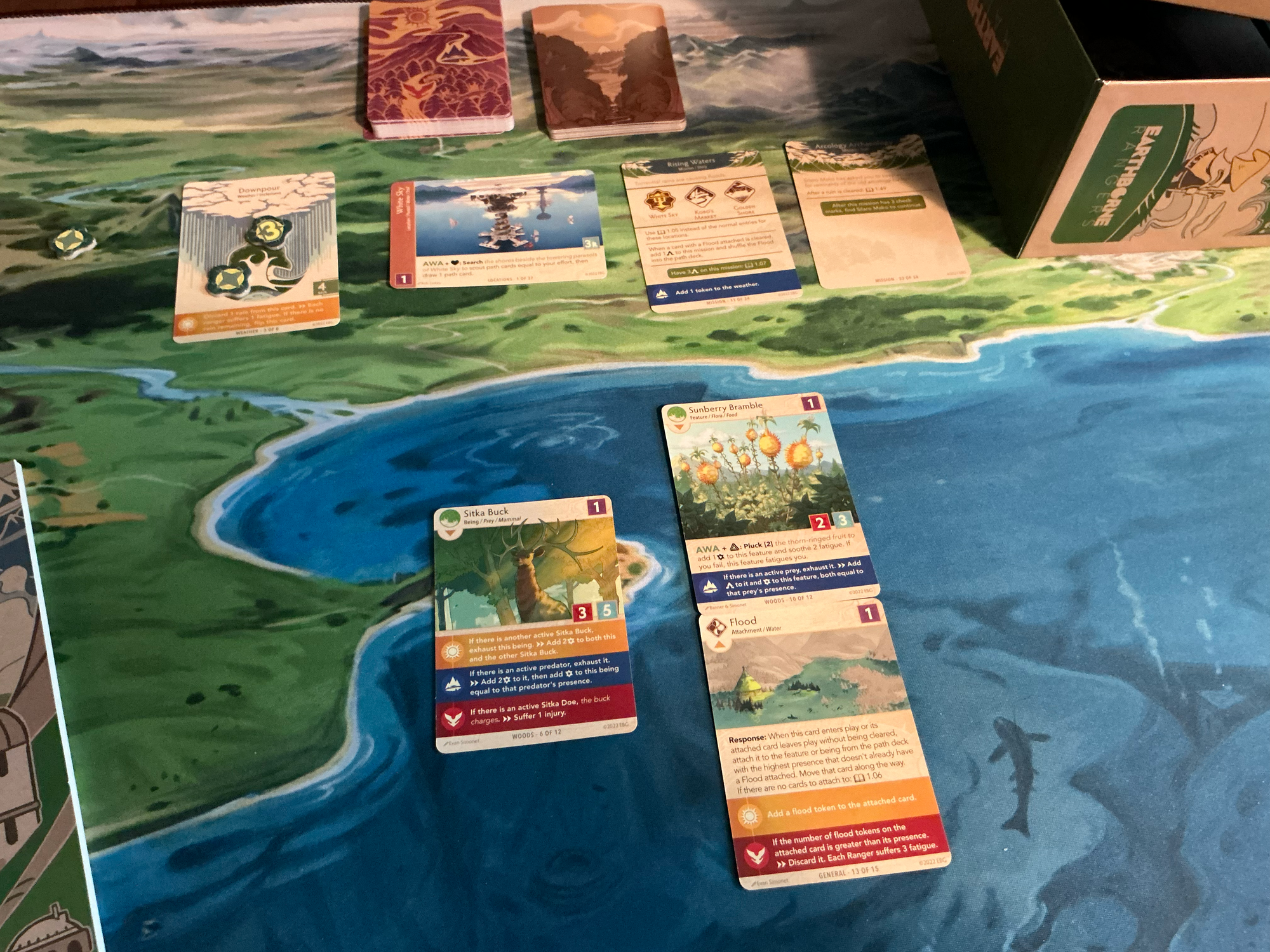 One of the most impressive things it manages to do is having an array of themed environments, Woods and Lakeshore areas for example. Each of these have cards that interact with each other, either in specific or generic ways. Some examples of this: Flora that gain damage from any Prey within the vicinity, or two Stika Bucks fighting each other for dominance, Predators that initially come in exhausted if there's already a Predator around, and more. What's important here is that all of these interactions make so much thematic sense. Sure, mechanically its just Card A has a triggered effect that interacts with Card B... but the theme and flavor carry it so well that I think it's disingenuous to distill it so reductively.
