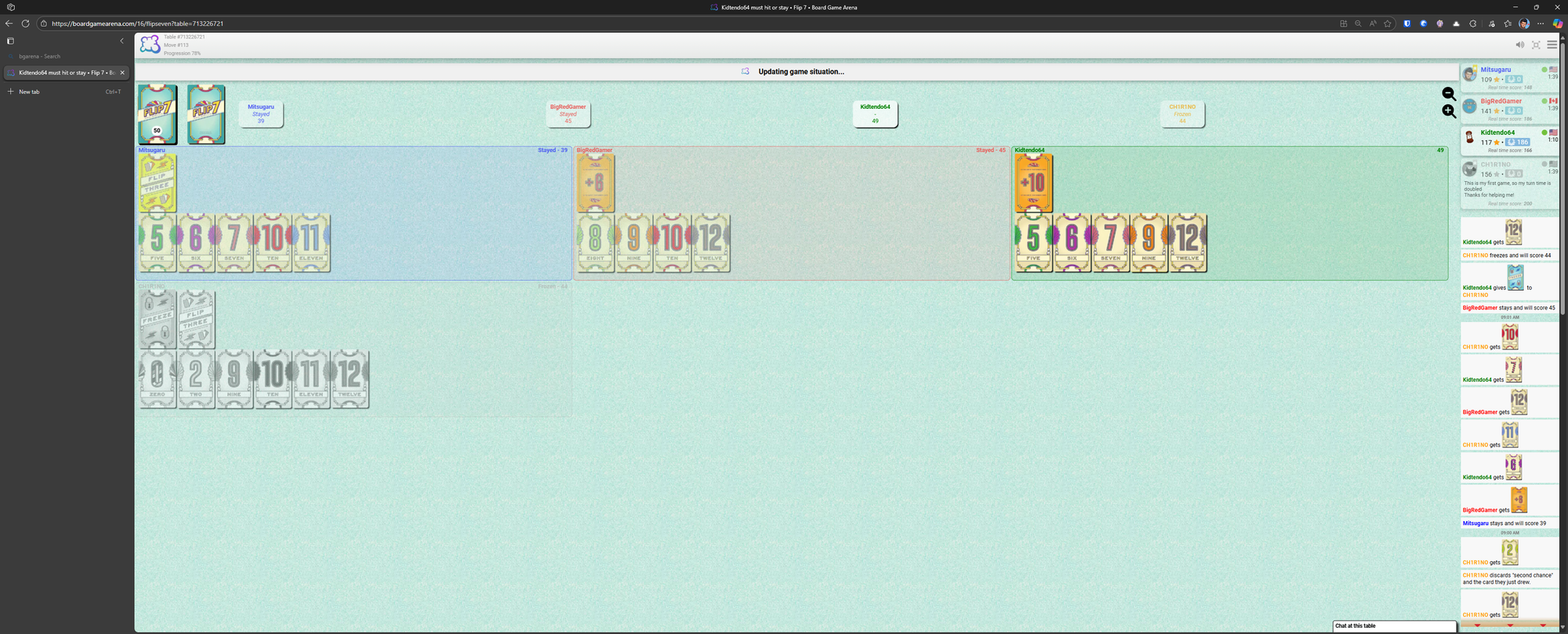 I had fun pushing my luck, there was a time where I got back to back Flip Three cards and I played them on myself and it worked out. Even got to 7 cards that round. Later in the day, met up with friends at Zulu's Board Game Cafe and we actually played this as our starting filler game while we ate. Because of how it plays it was easy for me to drive the game and make sure turns and actions were taken quickly, and people had a fun time reacting to others busting or pushing their luck successfully.