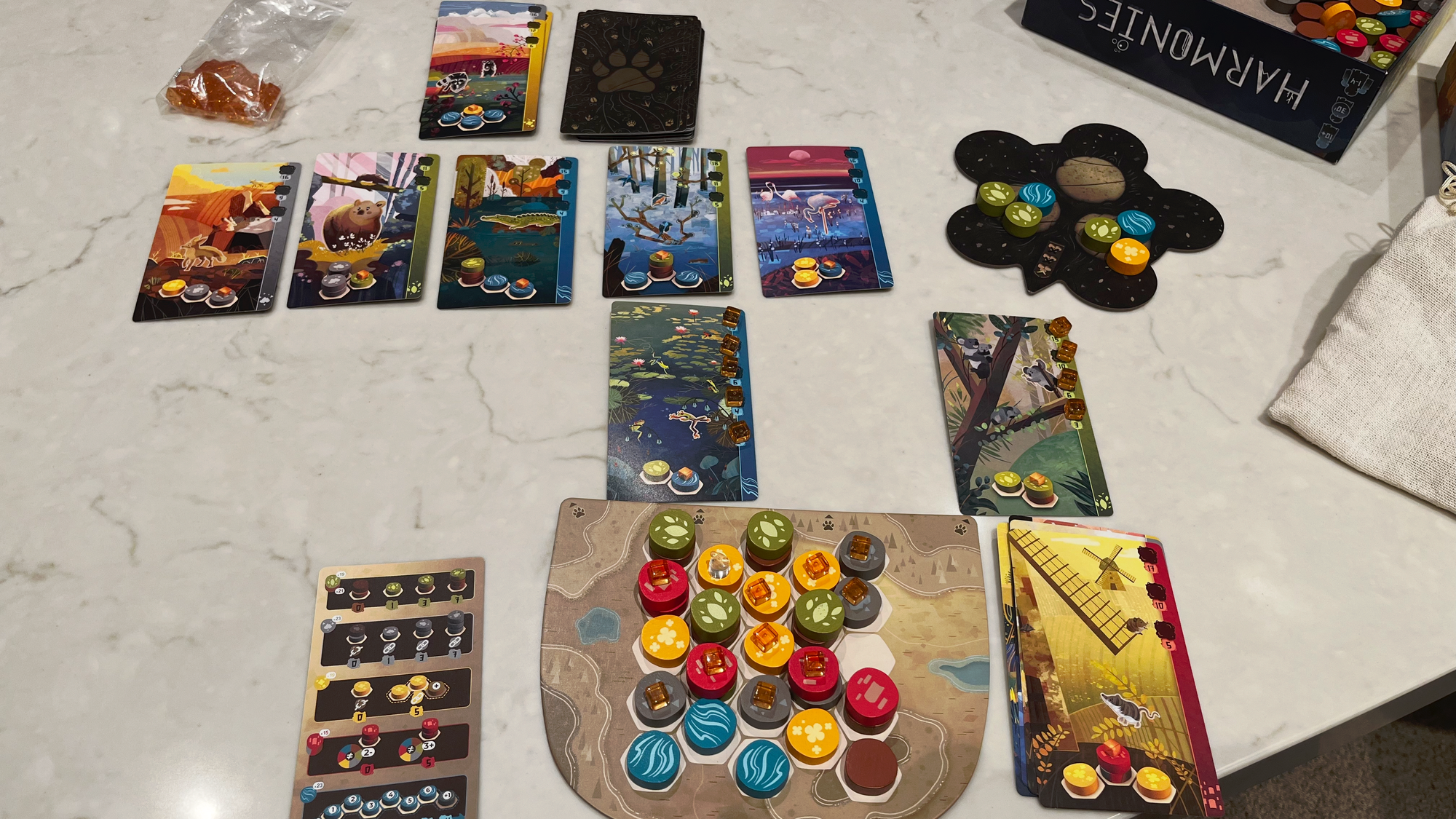 Scoring is simple, divided between the tokens you've placed and the animal cards you've fulfilled. I do think people can run into being surprised the first time with scoring tokens as it's very easy to simply focus on just the animal cards alone, similar to how in Cascadia the region majority can catch people off guard.