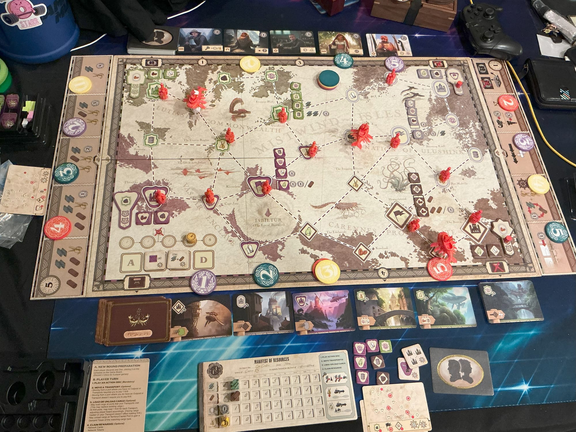If that cover doesn't spark interest then you haven't watched enough Ghibli films, honestly the striking art is what drew me to this game. Which is funny because then you look at the board and its very beige. I get that its meant to be a bit more of a cartographer's map of the world that your flying whales are traversing, and it makes it very clear where things are as colorful player pieces pop out in color, but its quite the contrast. Instead, you get see snippets of the vibrant fantasy world through the port card landscapes and the different character cards.