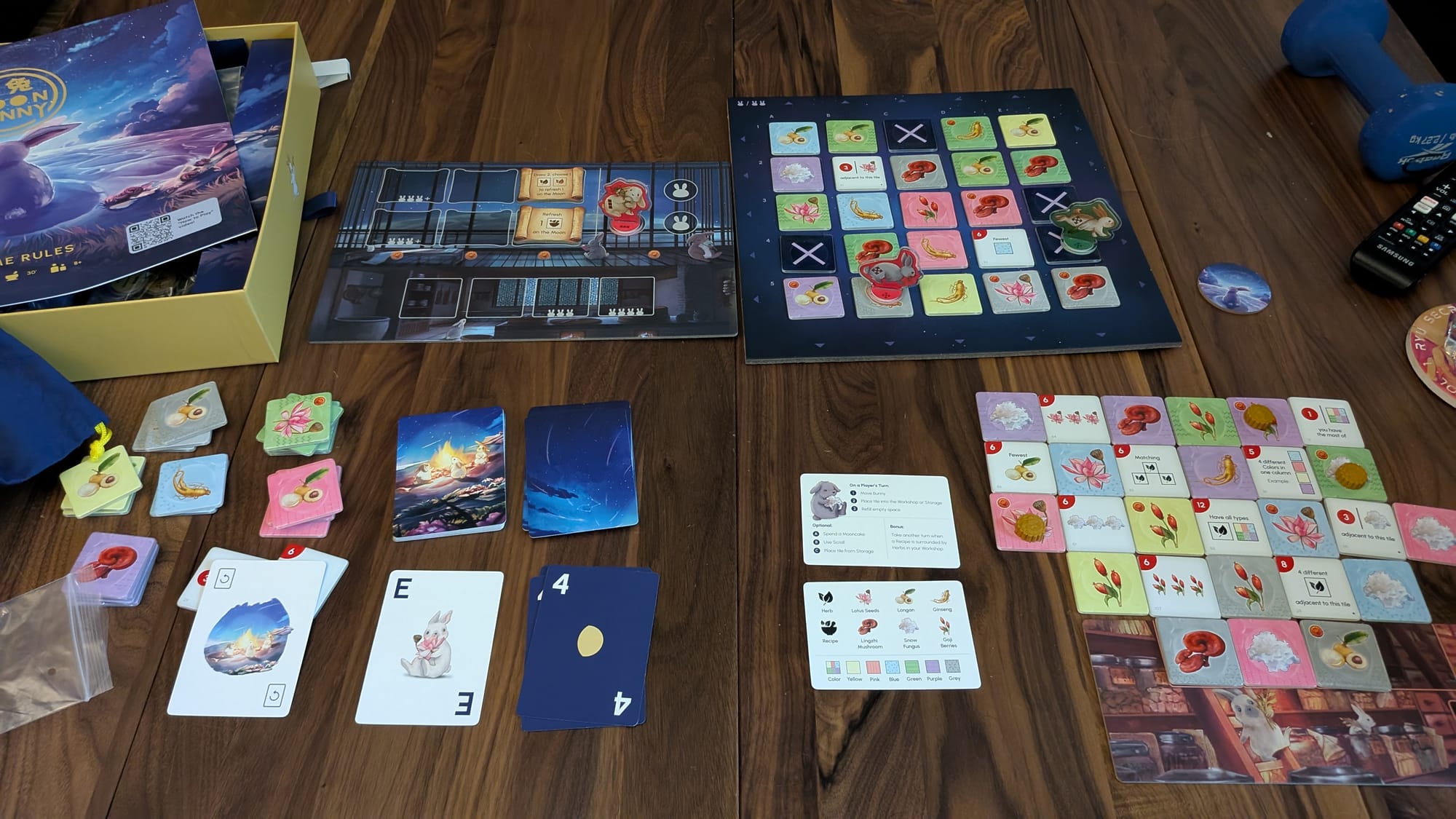 The gameplay is very simple. On your turn you'll move your bunny on the main grid to collect a herb or recipe tile and then add it to your grid. Often you'll be building out in a checkerboard like way as one of the main ways to get extra turns is by surronding a recipe tile with herbs on all sides. Some herbs will grant you mooncakes which let you buy special one time use abilities or switch out your rabbit as they have two different movement styles. The game ends when there's no more recipe tiles or if the bag runs empty when refilling the board.