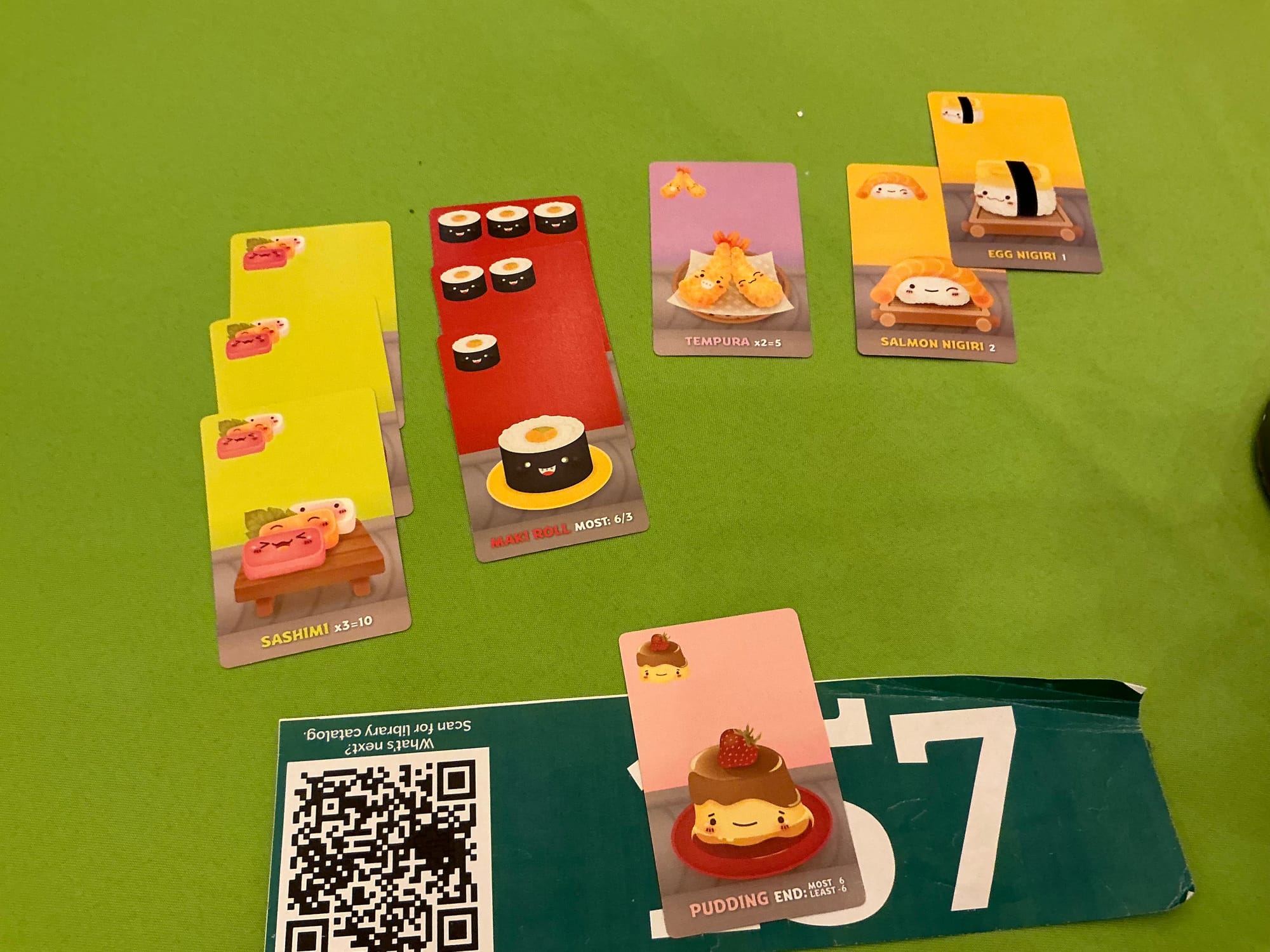 I found myself often leaning into the collecting the most Maki roll cards just because my first hands had those high 3 value cards. Also tried my best to go for the triple Sashimi set. I basically ignored pudding until near the end of the 2nd round where I got at least one to sort of pressure one of the other opponents to waste a draft for it. They didn’t do that in the last round and ended up taking the negative points at the end, which mattered for final scoring.
