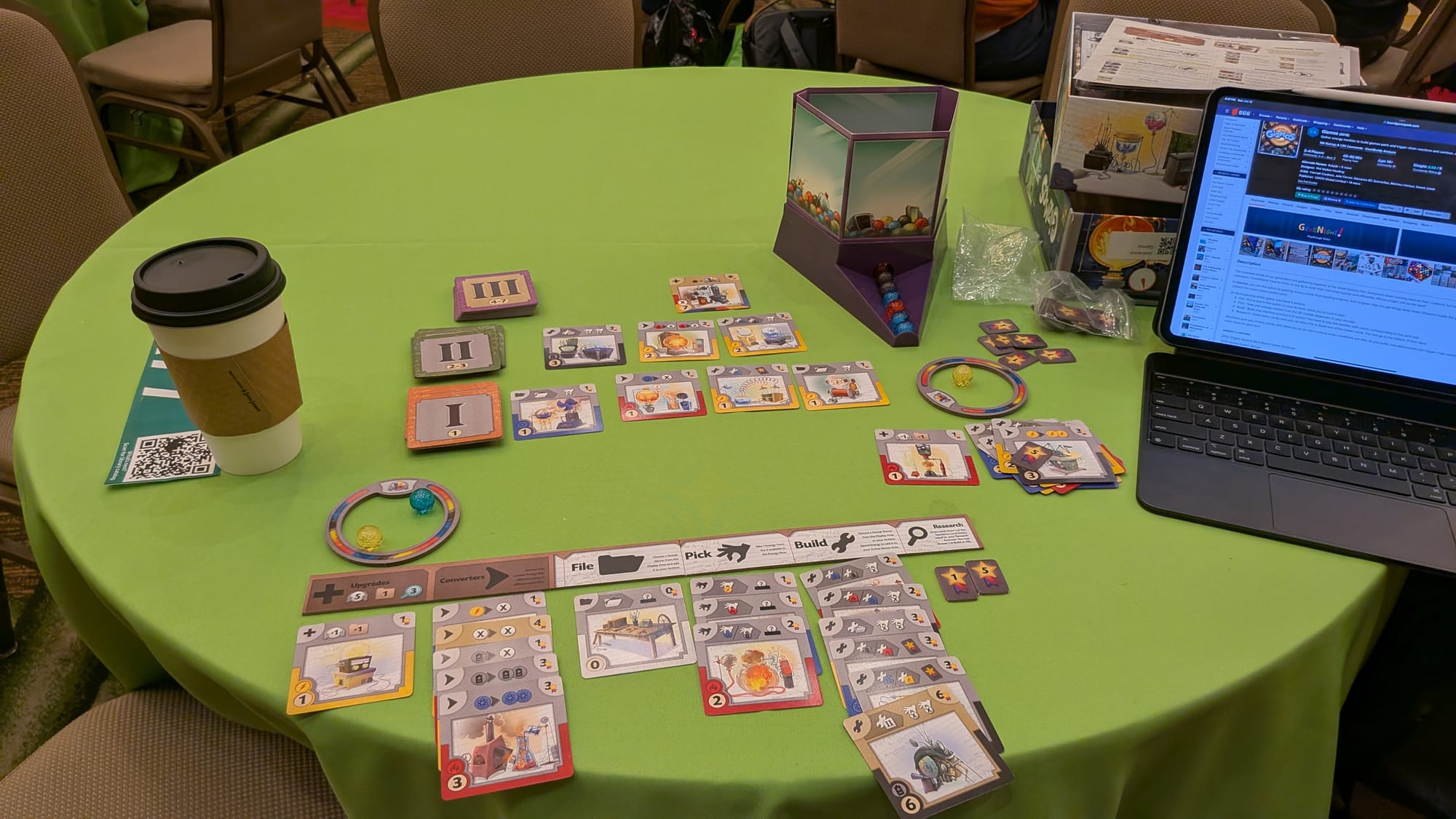I've played with marbles for a lot of my childhood and came up with all sorts of little games to entertain myself with. I no longer have that collection but I still feel that marbles are pretty neat. Gizmos uses marbles with a dispenser as a means to have randomized resource offering. So at any time there's six marbles that are offered and you can sort of peek to see what's coming next.