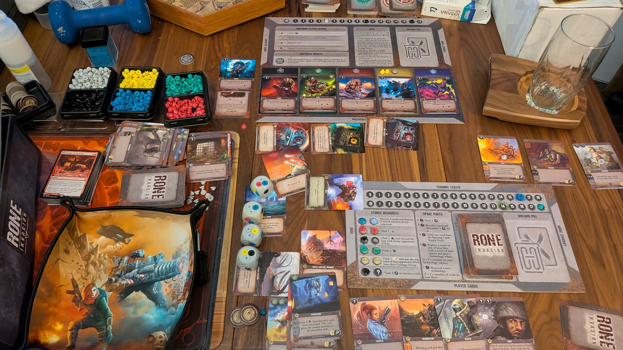 RONE: Invasion got onto my radar because of its interesting custom dice. We've seen custom dice from other games, such as Dice Realms and Dice Forge, but this one took a step further where you screw in the pips on the side of a die to change it. That extra level of customization intrigued me. Factor in that it advertised itself as a hybrid deck builder with these dice, had co-op, solo and competitive modes, and with interesting post-apocalyptic art I figured it could be worth a shot. Delivered almost three years later, I took some time to learn the game after sorting and organzing the large box.