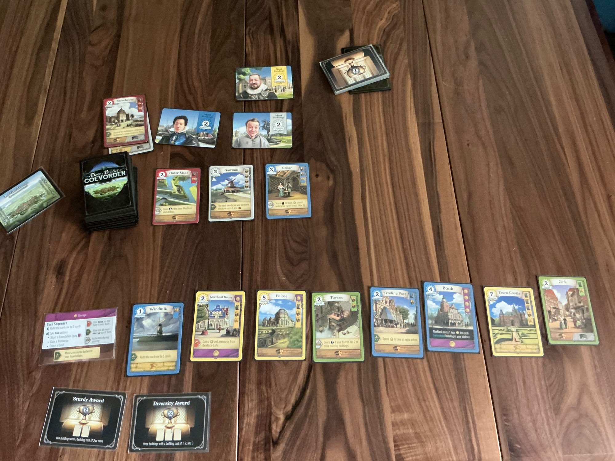 The main feature is that the whole game operates on a single deck of multi-purpose cards and everyone will be vying for what is available in a shared market row. These cards are the buildings you want to construct for your town while also being resources that you'll gain and spend for buildings. There's a set of public scoring goals that are shown at the start of the game as well as some that will be discovered as you go through the deck of cards. You'll be constructing buildings for their points, their types which could matter for scoring or for awards, as well as for abilities which help with your limited action economy.